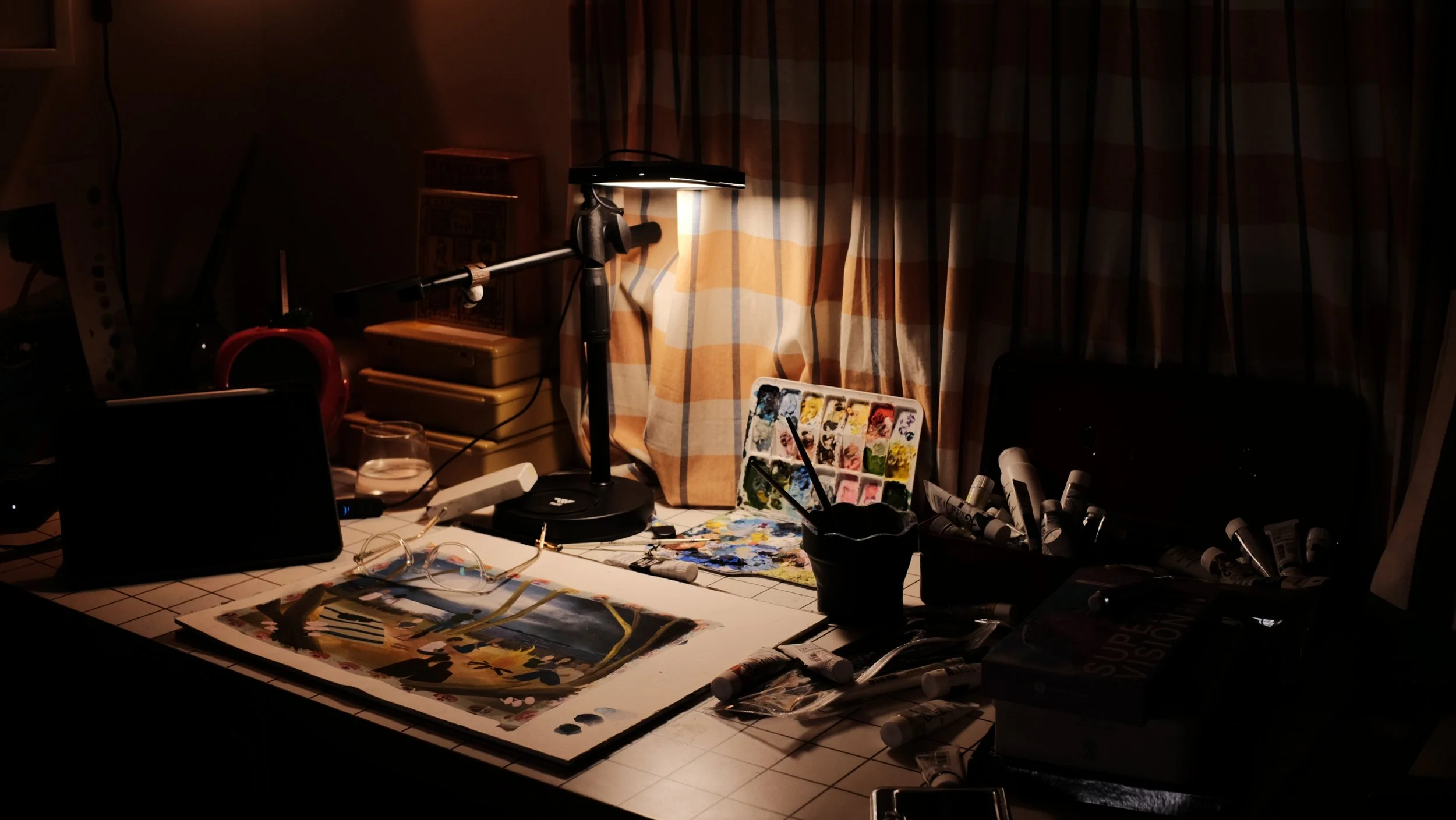 My always messy worktable. Tubes of paint overcrowding a toolbox, boxes and boxes of containers (attempts to organize the space), smatterings of paint and tattoo stencils on the desk.